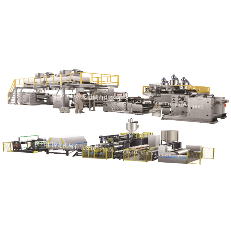 鑄龍ZLX-LM擠出淋膜復合機組系列,利用PE/EVA/PP/TPU/POE等熱塑材料的擠出工藝,對基材進行單/雙面覆膜或多層復合,形成具有多種功能的復合制品。該系列設備擁有多種模塊化結構,通過模塊組合,可以實現低速、中速、高速、超薄、超高克重淋膜復合功能,適用淋膜基材涵蓋薄膜、無紡布、珍珠棉、發泡卷材、紙、紡織品、編織布、針刺布、水刺布、網格布、功能隔膜、金屬箔、鍍鋁膜等。通過單機、雙機、多機以及單層/共擠、預熱、預涂、復合等功能選配,可以滿足食品、外包裝、裝飾品、建材、農業、光電、車船航天功能材料等領域的廣泛需求。